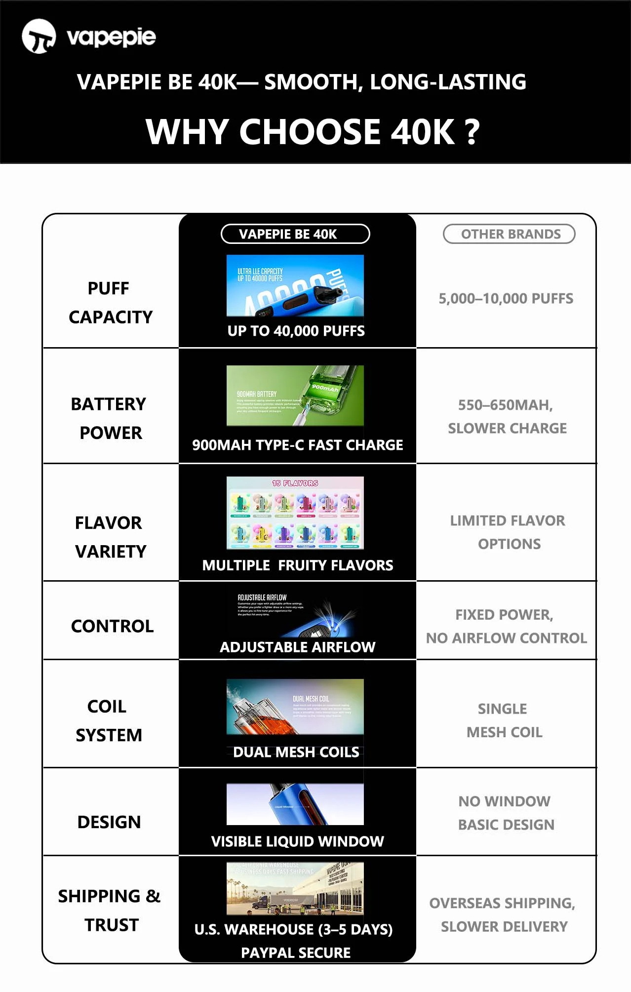 A1: Up to 40,000 puffs, one of the longest-lasting disposable vapes.